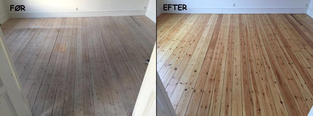 Gamle trægulve kan forbedres ved at slibe dem og anvende en passende efterbehandling. Dette kan hjælpe med at fjerne gamle ridser og pletter og bringe træets naturlige skønhed frem.